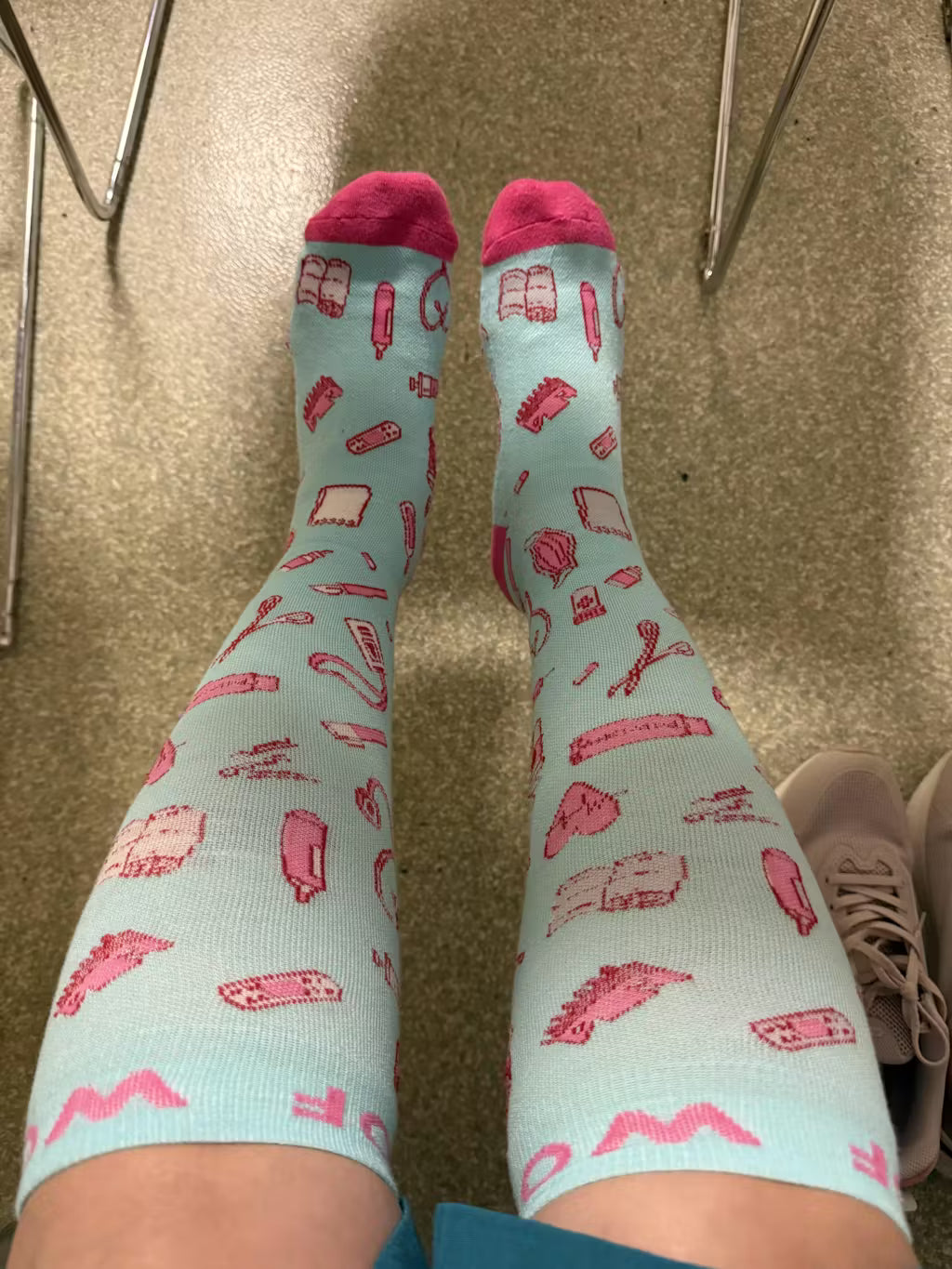 Gün boyu süren nöbetlerden bacaklarım iki katına çıkıyordu ayakta durduğum her saniye bıçaklanıyor gibi hissediyordum korkunçtu yani ama şimdi o kompresyon çoraplarının işkencesine maruz kalmadan rahat bir şekilde günü tamamlıyorummm